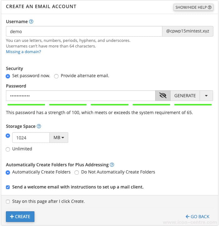 2.為該電子郵件地址設置密碼。如果想確保電子郵件帳戶的密碼超過系統的最低安全分數(65)要求,可點擊‘GENERATE ’以生成強密碼。切記將密碼複製存儲,以防忘記密碼。
